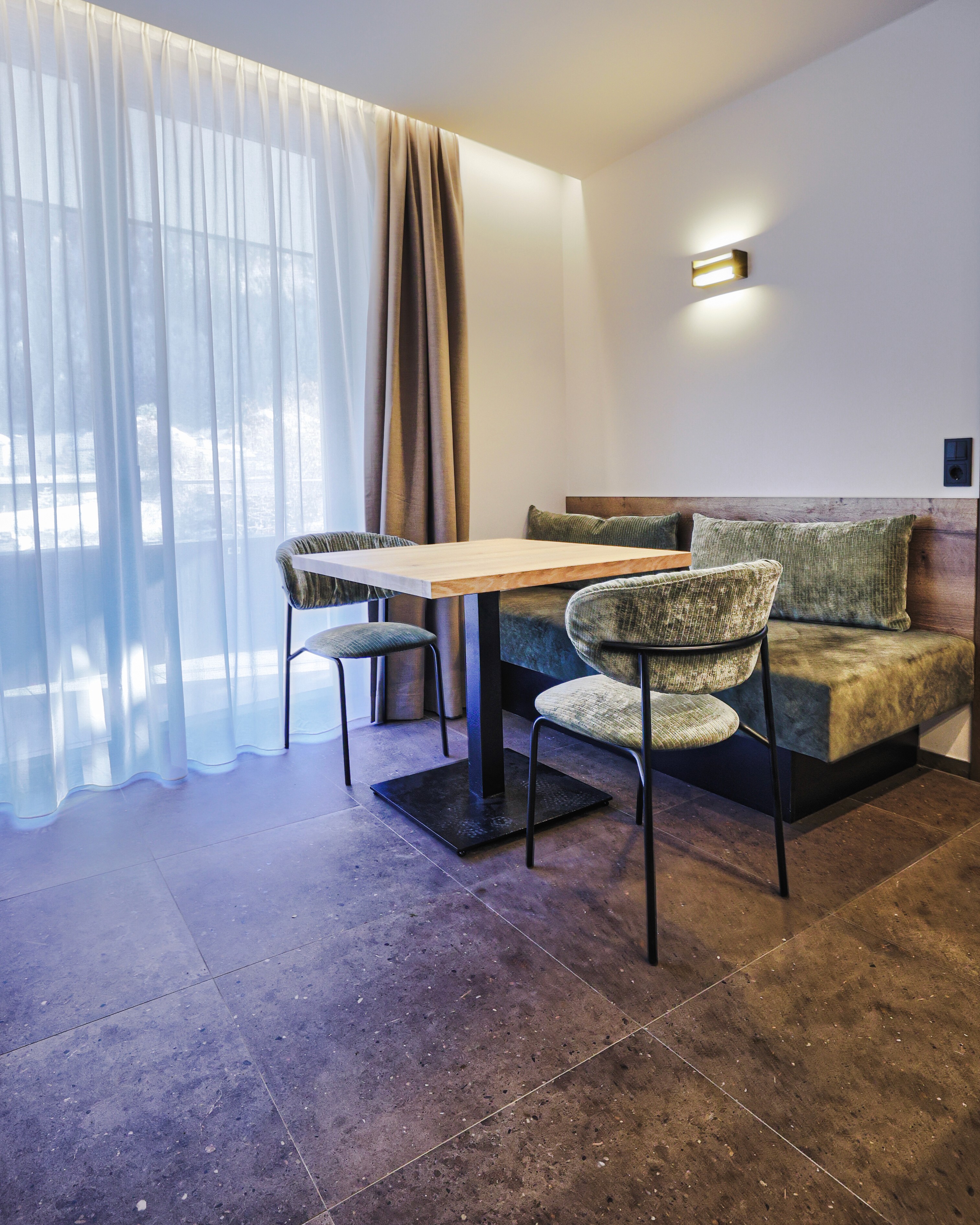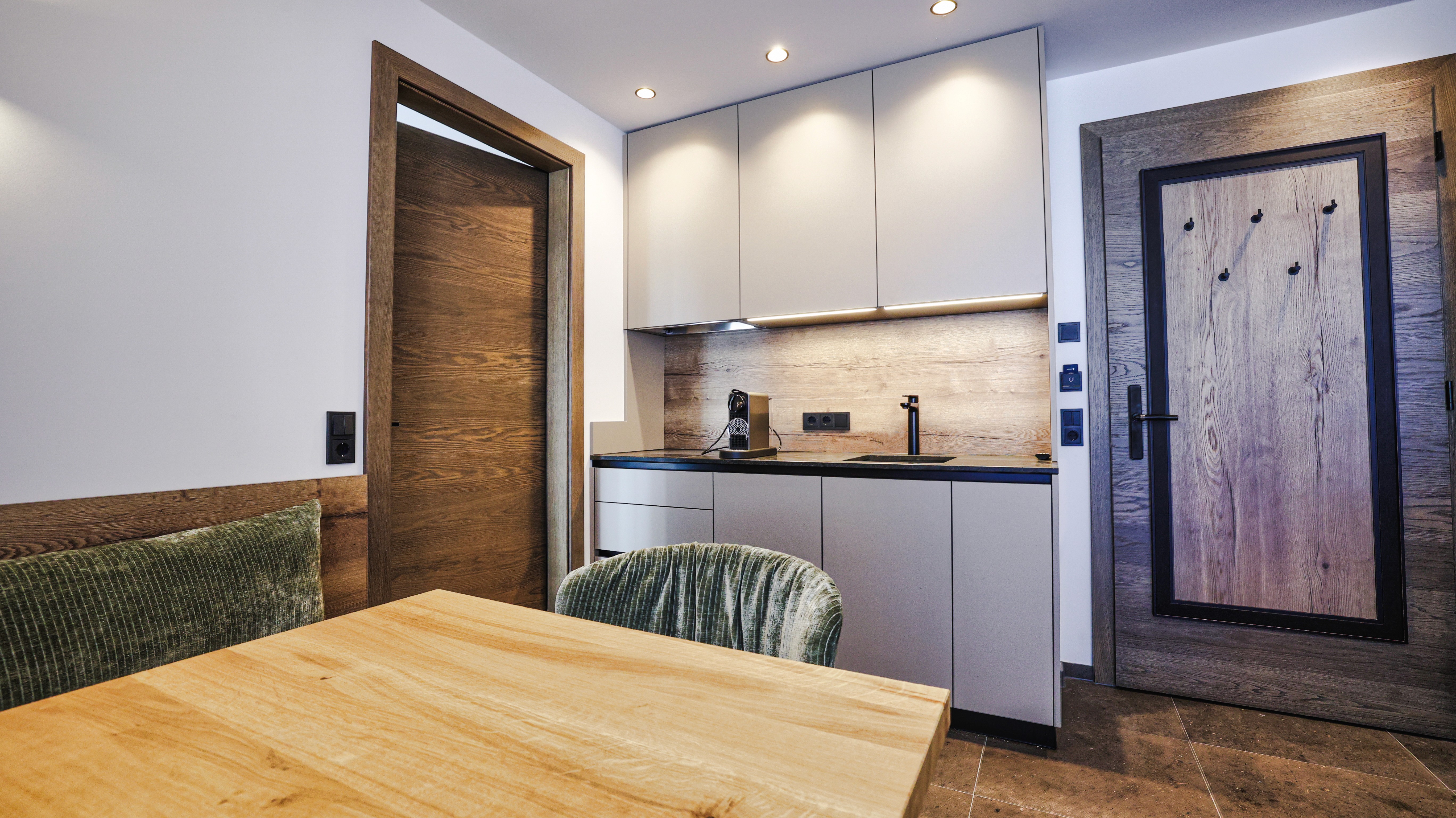 The approximately 28 sq. m. apartment combines alpine charm with modern comfort and can accommodate up to 3 people. Enjoy restful nights in the separate bedroom with a high-quality box spring double bed and a cozy kitchen-living room with sofa and spacious dining area. Large windows ensure rooms flooded with light and a fantastic view of the surrounding mountains.