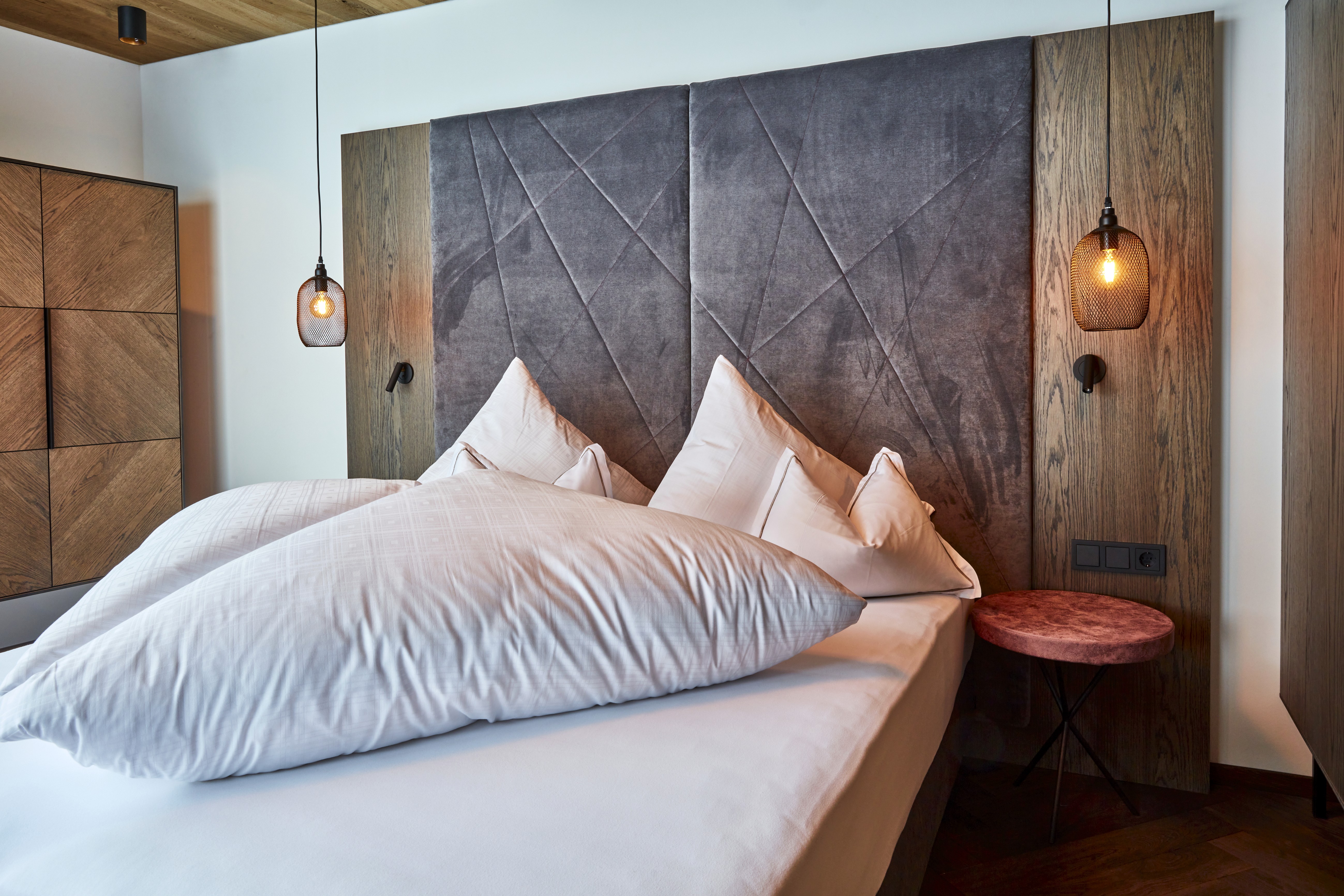 Your approximately 30 m2 large Junior Lodge in modern Alpine style offers a large box spring double bed, a cozy seating area, and large window areas. Look forward to unforgettable moments in a tranquil atmosphere and enjoy amenities such as free Wi-Fi, a flat-screen TV, telephone, room safe, hairdryer, and bathrobe with sauna towels as well as bath slippers for your visit to our Alpina SPA. In the evening, you have the opportunity to enjoy delicious dishes in the in-house restaurant PEAK. We look forward to providing you with an unforgettable stay.